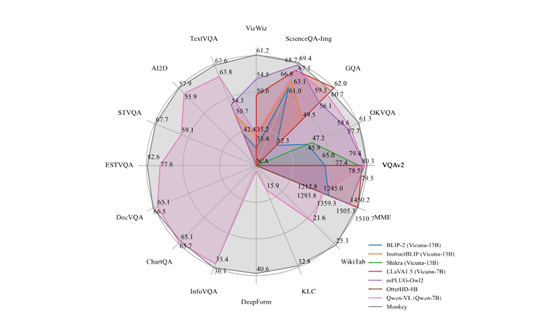 通用视觉问答:Monkey在VQAv2、GQA、OKVQA等多个数据集上都显示出明显的优势。